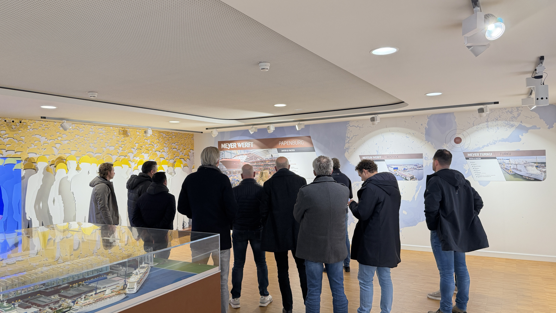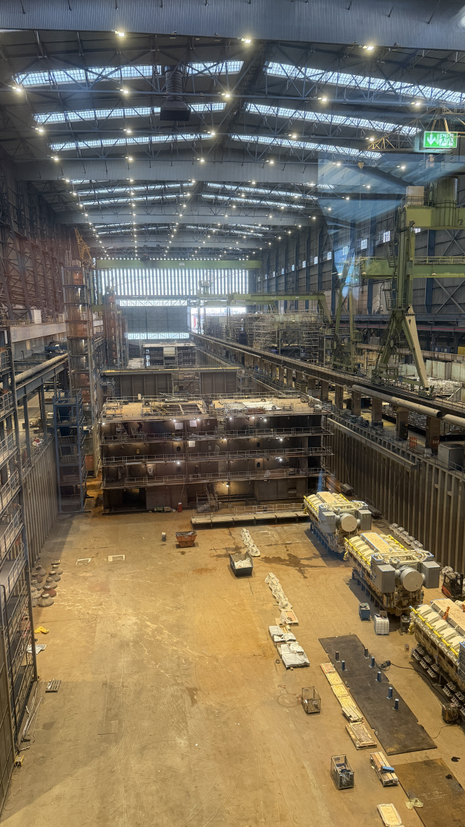 De Meyer werf maakte grote indruk, zowel door de omvang van de bouwprojecten als door de perfecte organisatie van de logistiek. Tijdens de rondleiding kregen we uitgebreide uitleg over het bouwproces en de bedrijfsvoering. Elk schip vertegenwoordigt een waarde van circa 1,2 miljard euro, wat onder de deelnemers uiteraard leidde tot interessante gesprekken over faalkosten in de bouw en de enorme financiële impact daarvan.